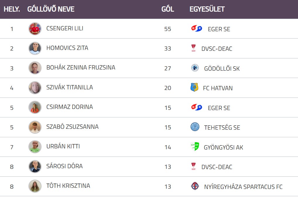 A góllövőlistát Csengeri Lili 55 (!!!) találattal vezeti, míg csapatunk a tabella élére állt – igaz több mérkőzést játszva, mint a második helyezett Debrecen.