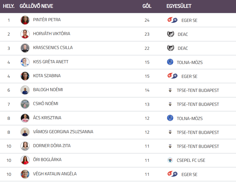 A góllövőlistát továbbra is Pintér Petra vezeti, de a két debreceni gólgyáros nagyon feljött rá. Kota Szabina az ötödik helyen áll, míg Végh Katalin a mostani duplájának is köszönhetően a tizedik helyre ugrott fel.