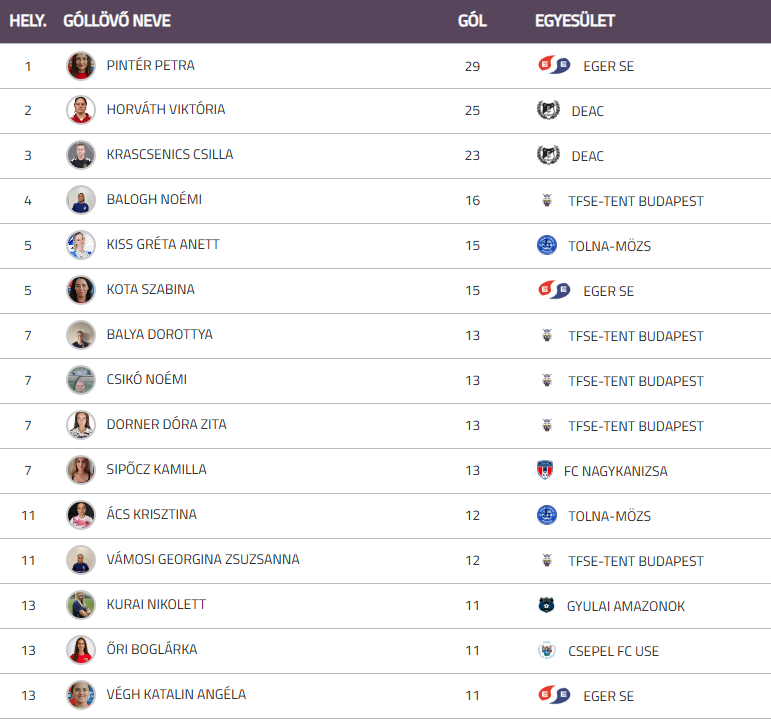 A góllövőlistát játékosunk Pintér Petra vezeti, aki egy bajnokival a vége előtt négy gólos előnyre tett szert, de a szabályok szerint azonos gólszámnál az a játékos a gólkirály, aki hamarabb érte el az adott gólszámot – ami azt jelenti, hogy az üldözőnek most már legalább öt találatot kellene szereznie az előzéshez. Ahhoz, hogy játékosunk kétszeres gólkirály lehessen, csapatunk ismét sokat tehet (ahogy az egész szezonban is), hiszen a dobogós játékosok éppen ellenünk fognak játszani az utolsó körben, hiszen a DEAC-ot erősítik.