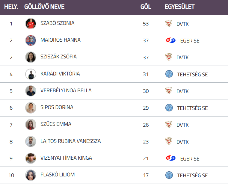 A csapat játékosa Majoros Hanna második a góllövőlistán.