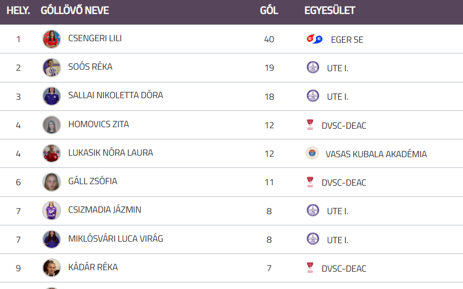A csoport góllövőlistáját Csengeri Lili vezeti 40 találattal.