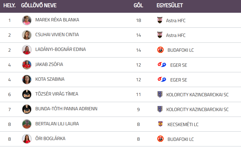 A góllövőlistán Jakab Zsófia és Kota Szabina holtversenyben foglalja el a negyedik helyet.