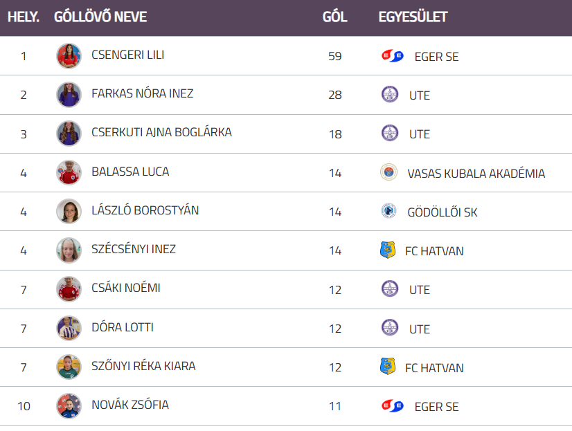 A bajnokság góllövőlistáját a leány U16-os válogatottba meghívott Csengeri Lili vezeti, 59 találattal.