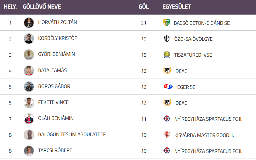 A góllövőlistán Boros Gábor továbbra is az előkelő ötödik helyet foglalja el.